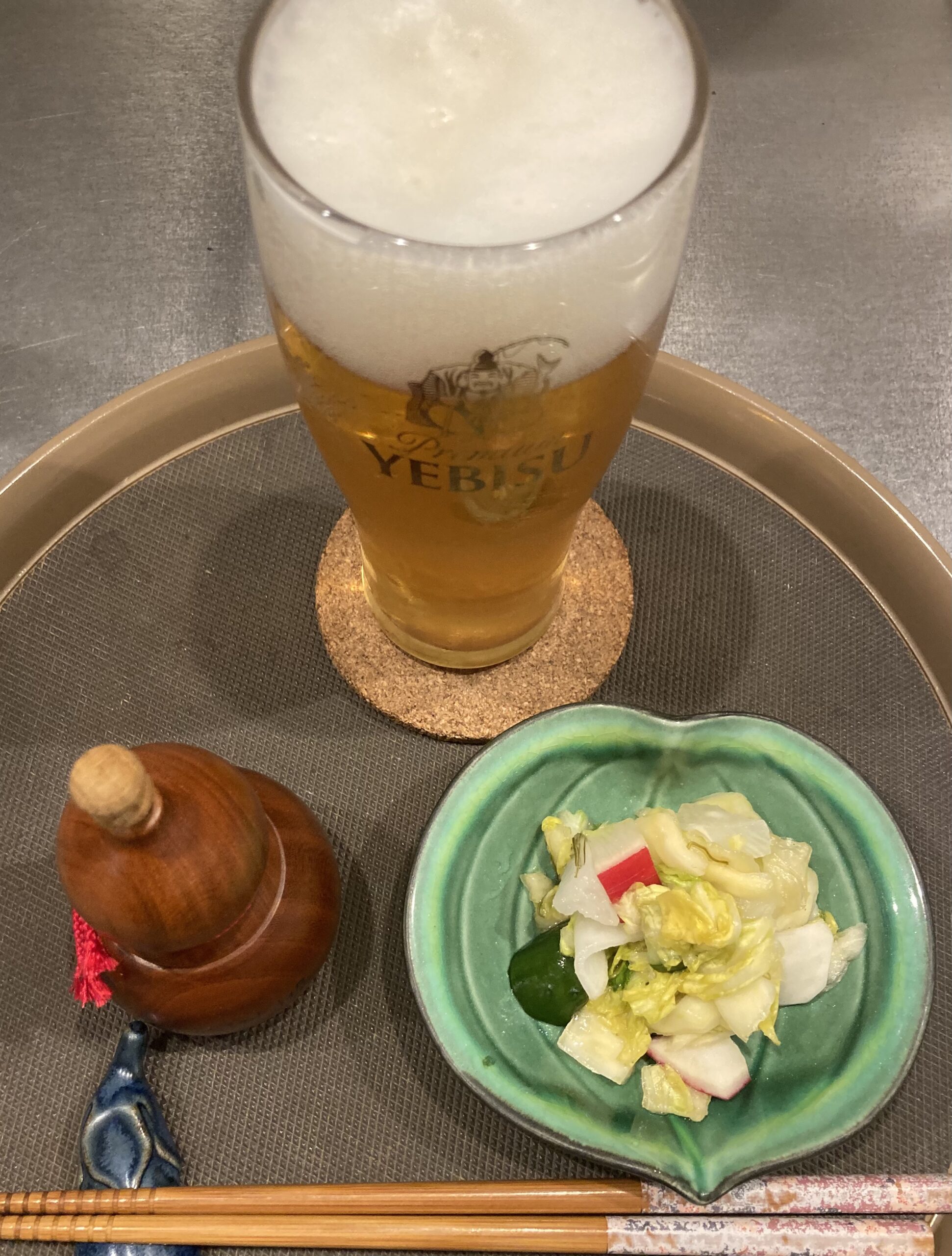 中国から来訪のお客様は岩手短角牛ハンバーグカレー。食前に有機野菜を使った自家製無添加お漬け物と恵比寿ビール。満足頂けたご様子でした😊😊。
