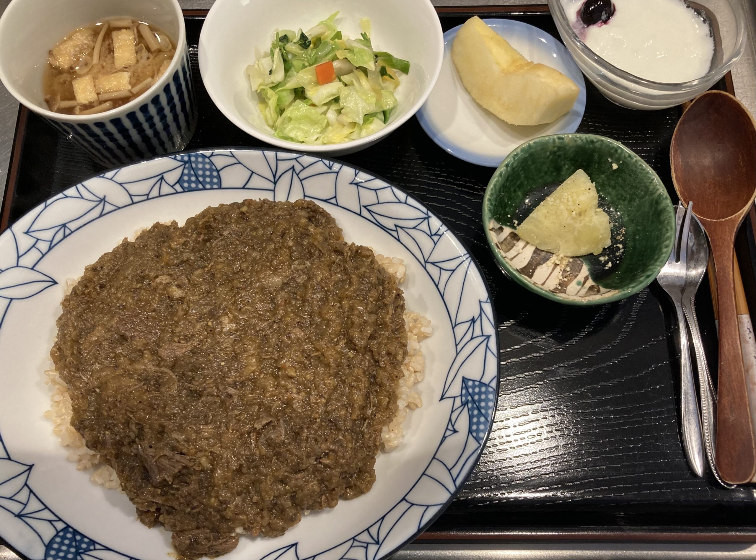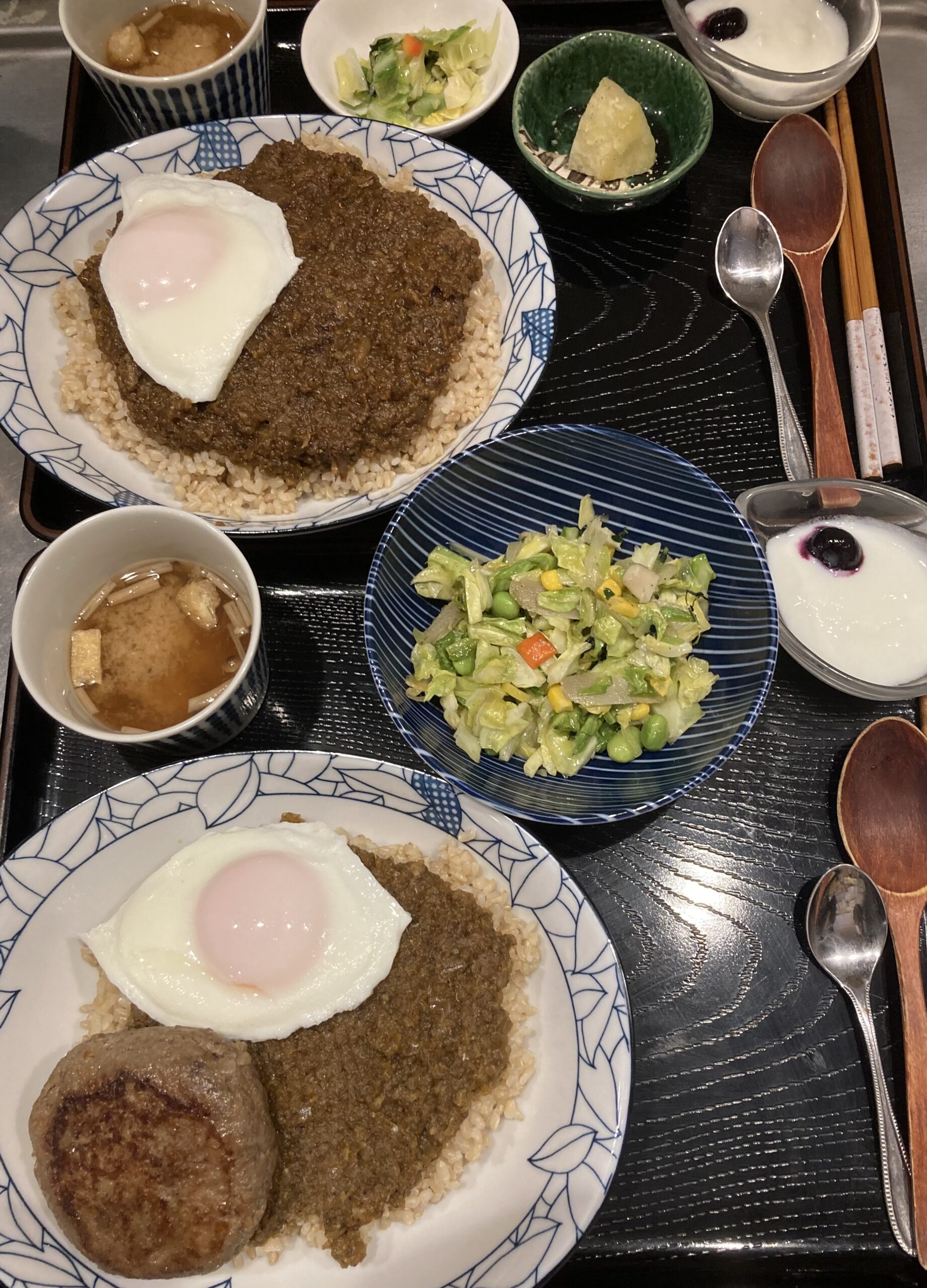中国から来訪のお若いカップルは辛い食べ物がお好みとのこと。辛口🌶の岩手短角牛すじ肉カレーに目玉焼き🍳、ハンバーグカレーに野菜炒め増量。お二方とも大満足でお帰りになられました😊😊。
