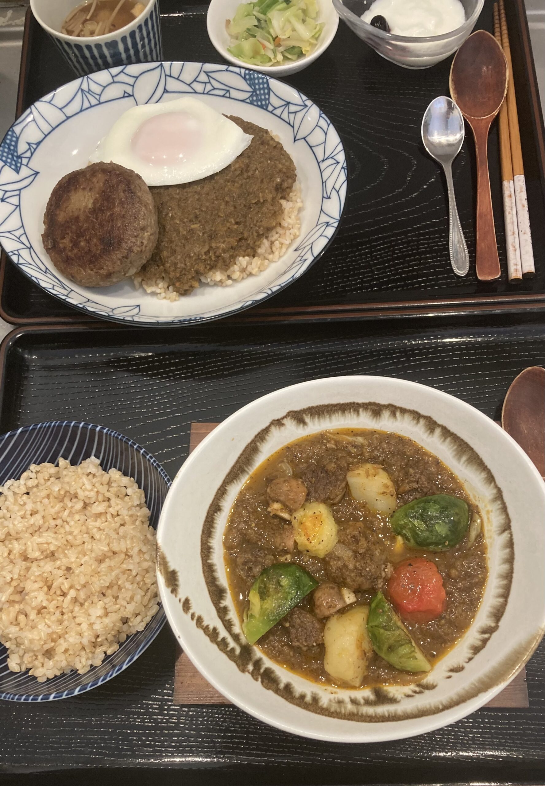 韓国から来訪のご夫婦は岩手短角牛ハンバーグカレー、不定期メニューの岩手短角牛すね肉・野菜薬膳スープカレー。食前に長野県伊那谷産の有機杜仲茶。旦那様はスープカレーの有機玄米ご飯🍚もお代わりされ、お二方とも大満足でお帰りになられました😊😊。