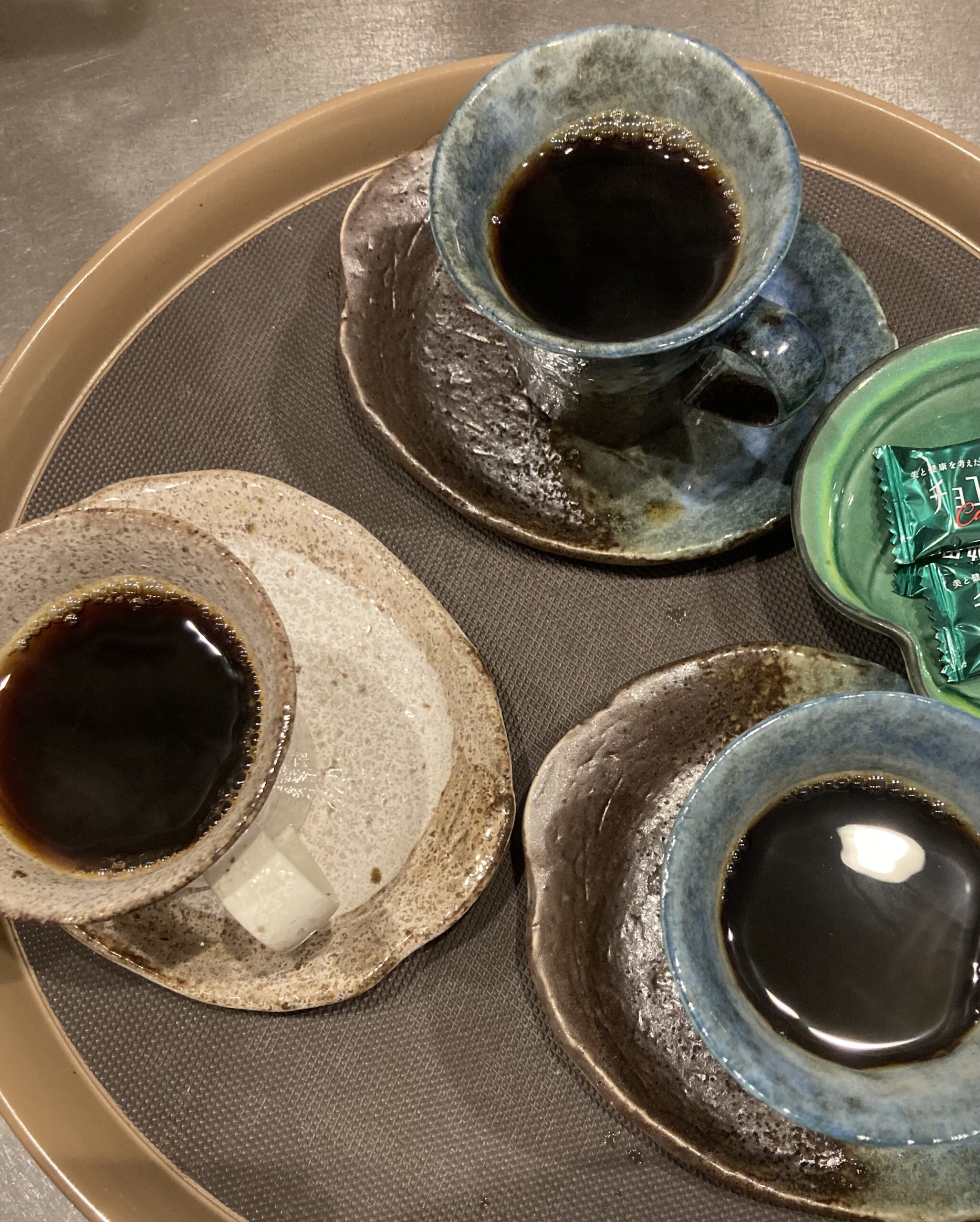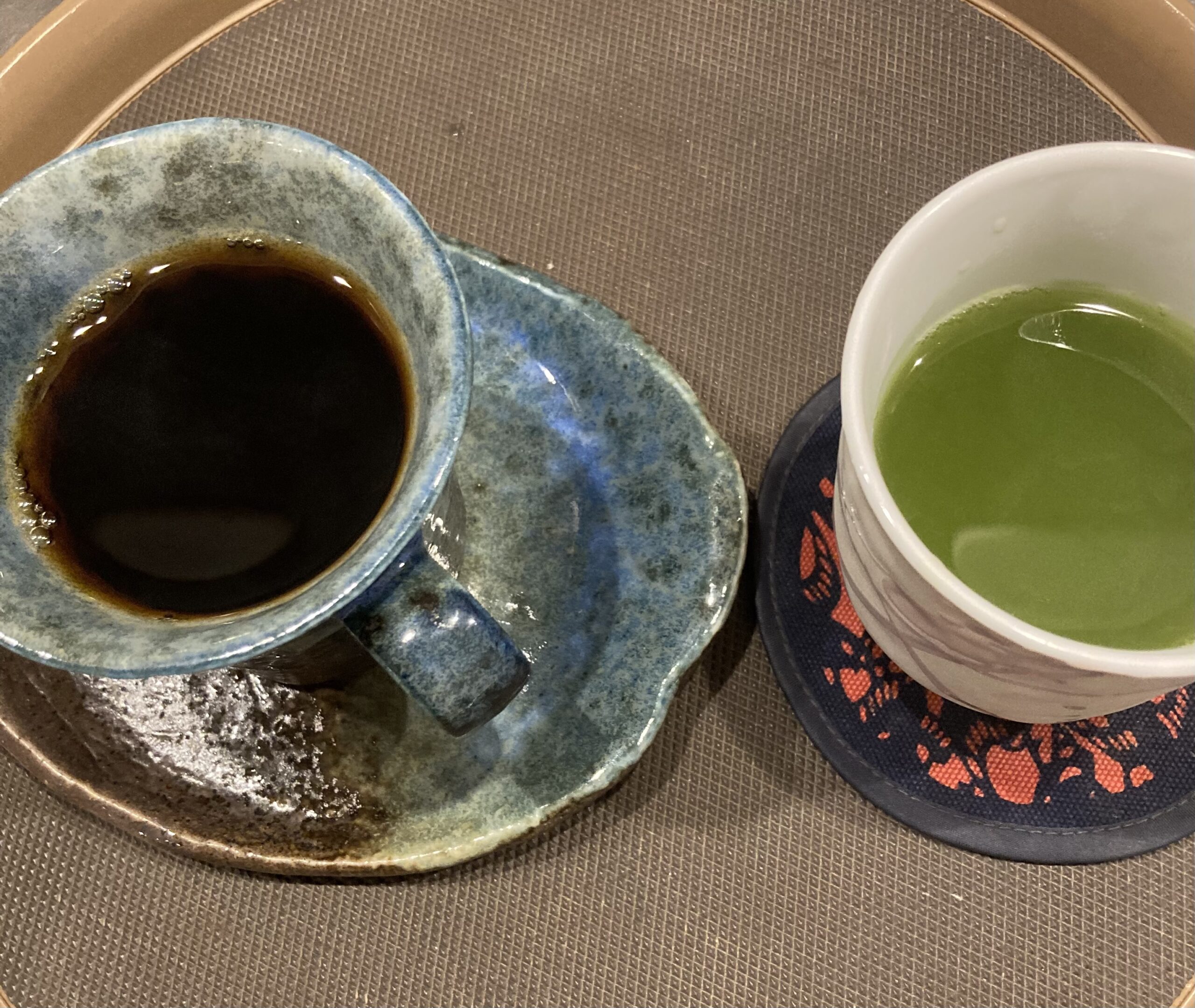 初来訪のお客様は食前にオリジナルブレンド・ハンドドリップ・ホットコーヒー、特別栽培の京都宇治抹茶入り緑茶。