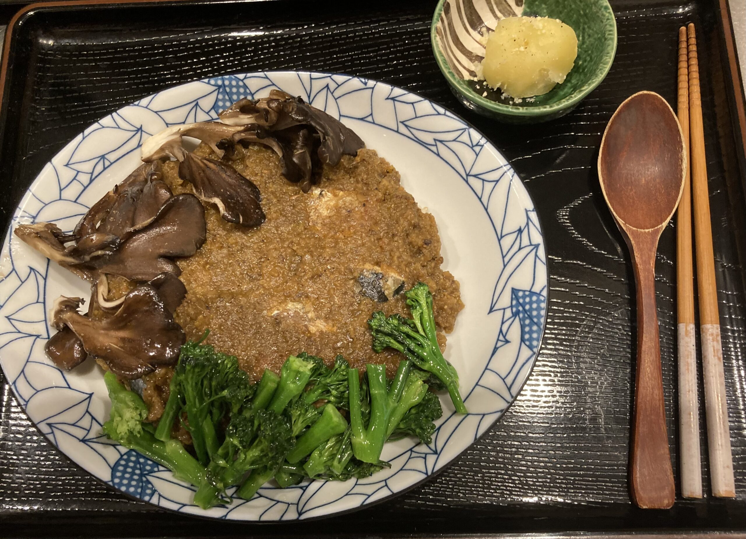 スイスから来訪のお客様は不定期メニューの魚カレーに特別栽培の茎ブロッコリーオリーブオイル焼き、黒舞茸ごま油炒め。「美味しかった!」と😊😊でした。
