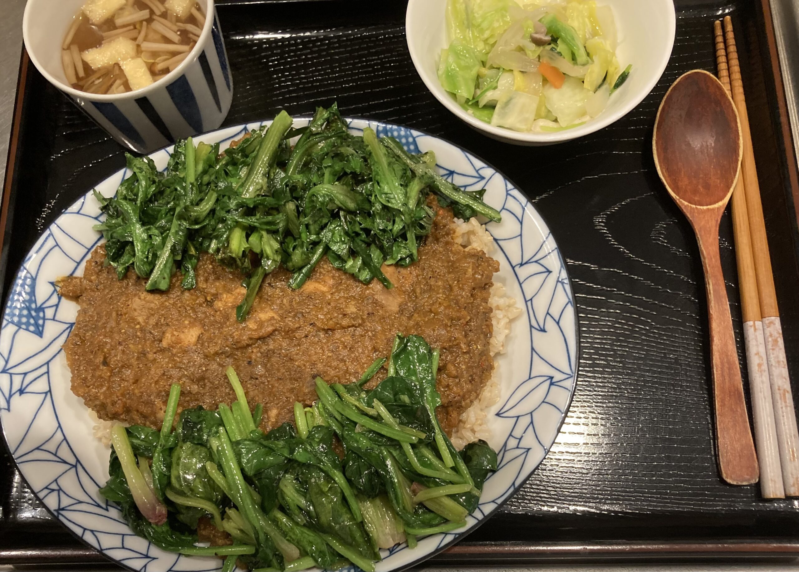 常連のお客様は前日に続くご来店。大辛🌶🌶🌶の銘柄鶏チキンカレー(ご飯🍚もルーも大盛り)に特別栽培の春菊ごま油炒め、ほうれん草バター・オリーブオイル炒め。