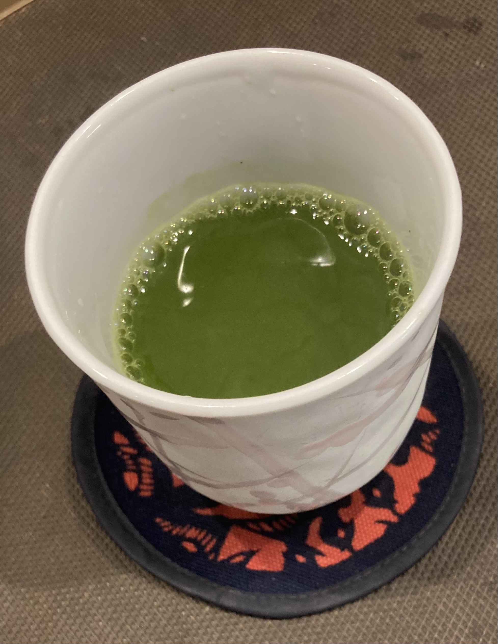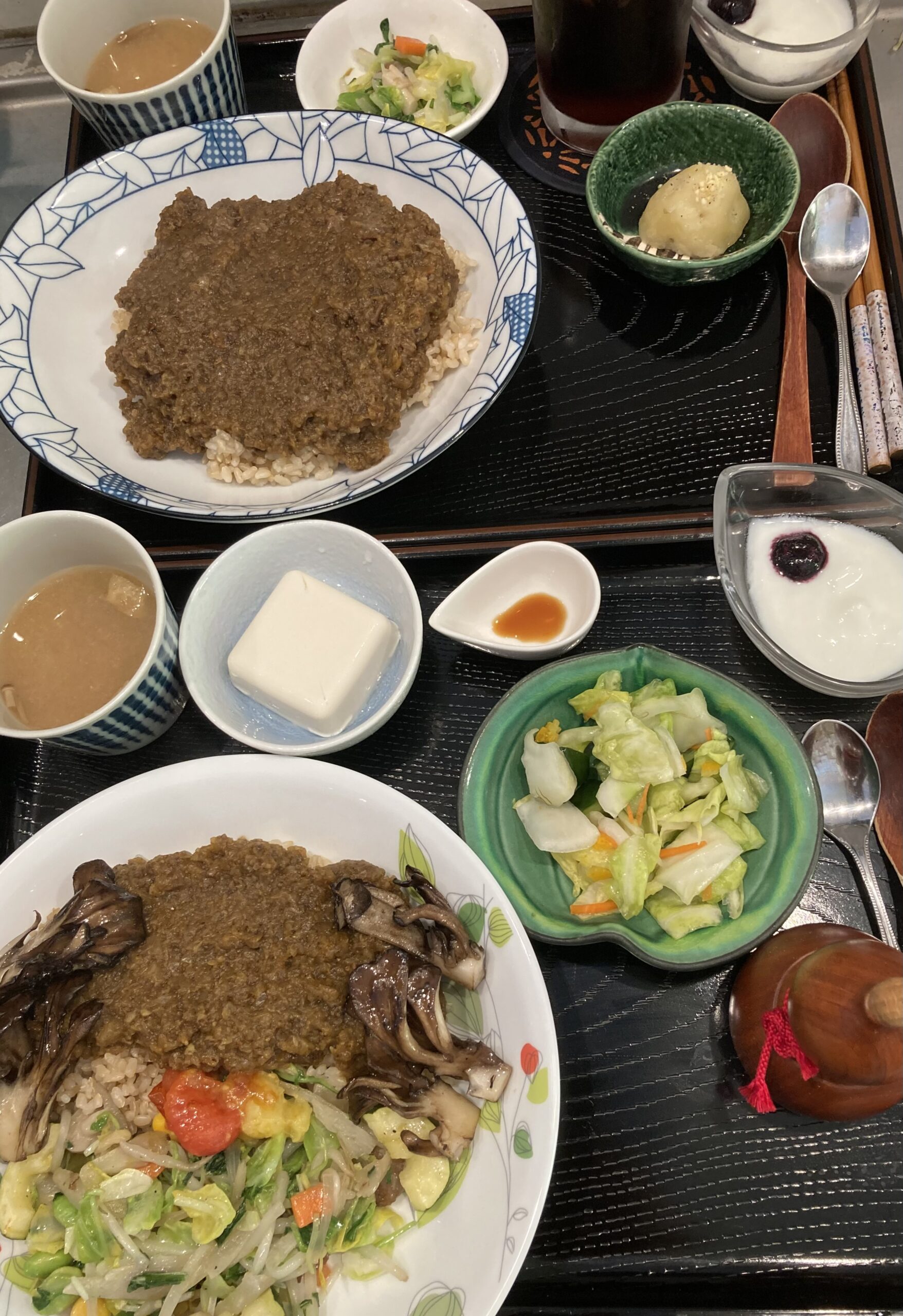 米シアトルから来訪のご夫婦はお豆腐付き野菜カレーに黒舞茸ごま油炒め、有機野菜使用の自家製無添加お漬け物(浅草やげん堀さんの七味唐辛子付)、岩手短角牛すじ肉カレー、オリジナルブレンド・ハンドドリップ・アイスコーヒー。食前に京都宇治抹茶入り緑茶。食後に岡山蒜山のアイスクリーム。