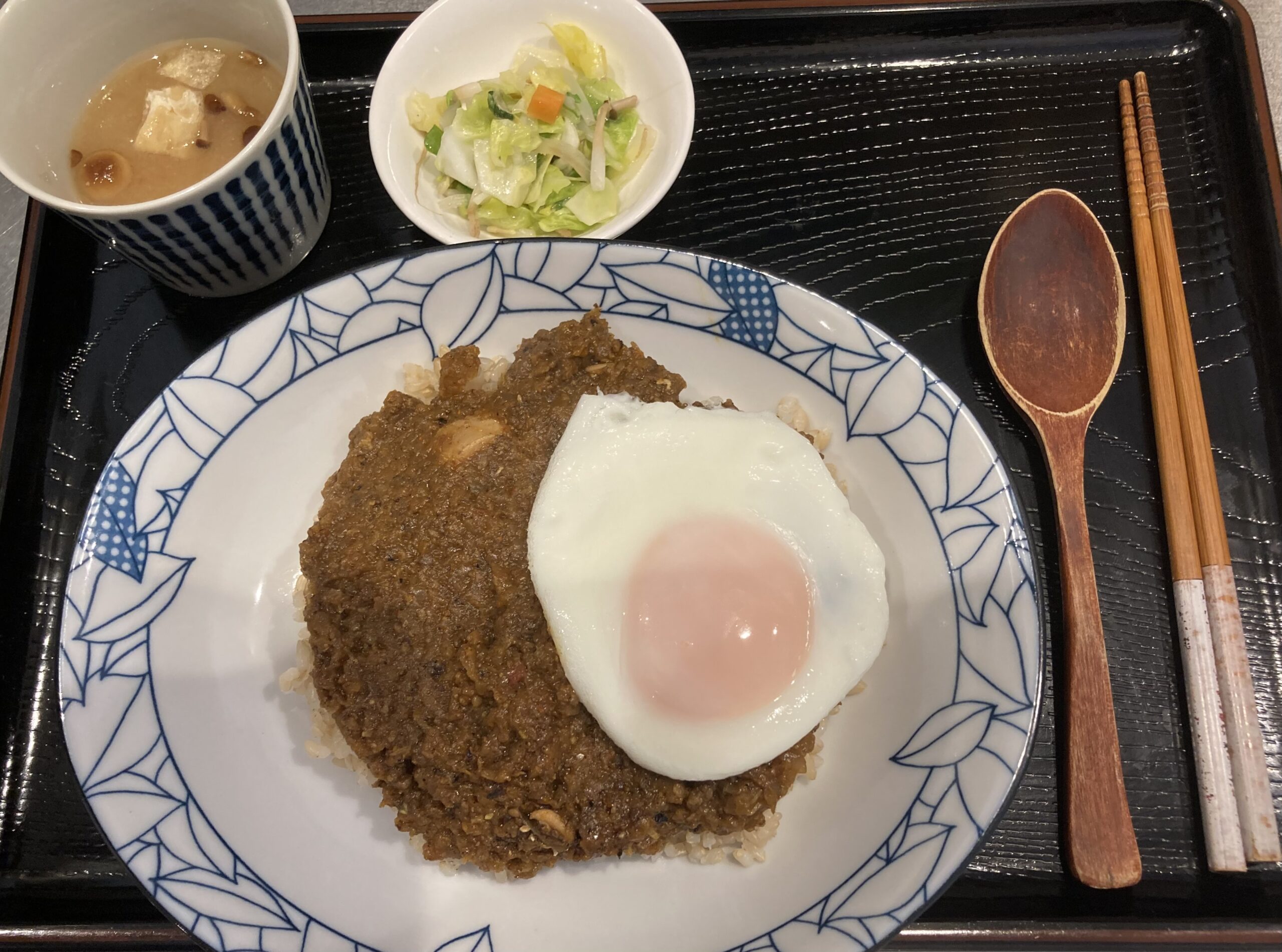 フランスから来訪のお若い女性(近隣大学に留学中)は辛口🌶の銘柄鶏チキンカレーに目玉焼き🍳。辛さ加減もちょうど良かったとのこと(日本のカレー店の辛口を物足りなく感じられているようでした)で、大満足でお帰りになられました😊😊。
