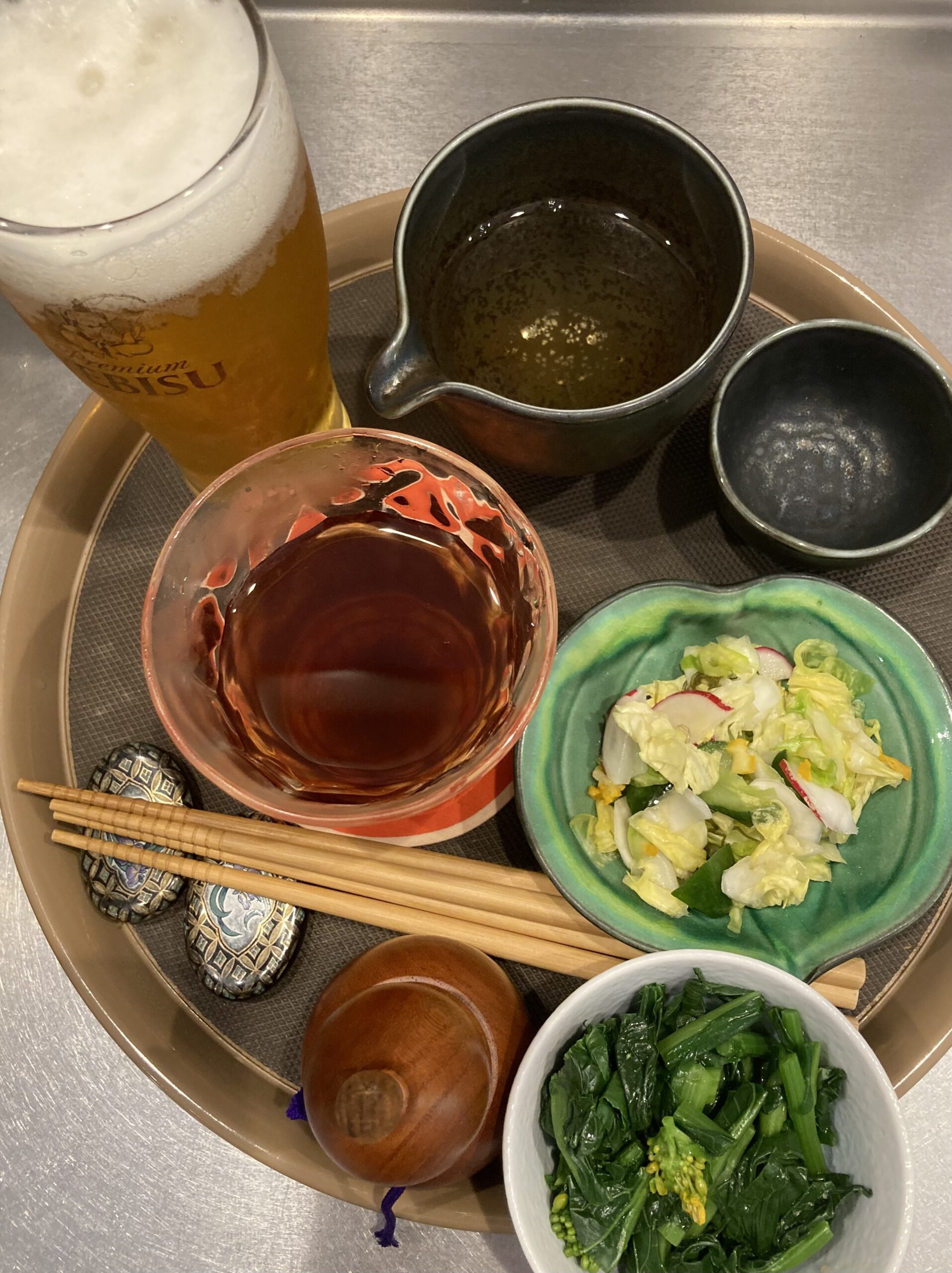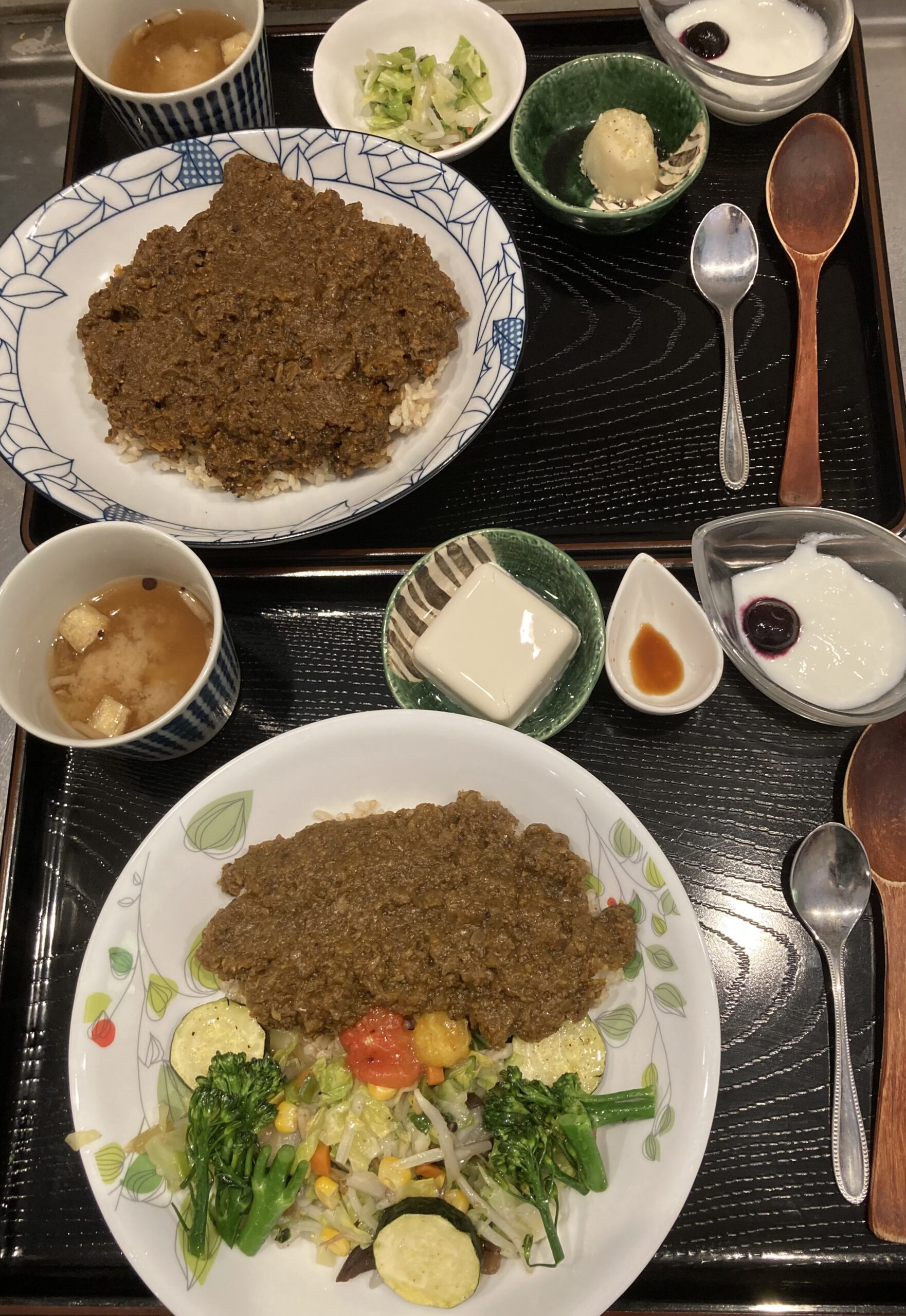 同じくフランスから来訪のご夫婦は辛口🌶の岩手短角牛すじ肉カレー、お豆腐付き野菜カレー。食前に有機野菜使用の自家製無添加お漬け物、特別栽培の菜花おひたし、長野県伊那谷産の有機杜仲茶、恵比寿ビール、石川県の純米吟醸酒「文政六年」。お二方とも😊😊でした。